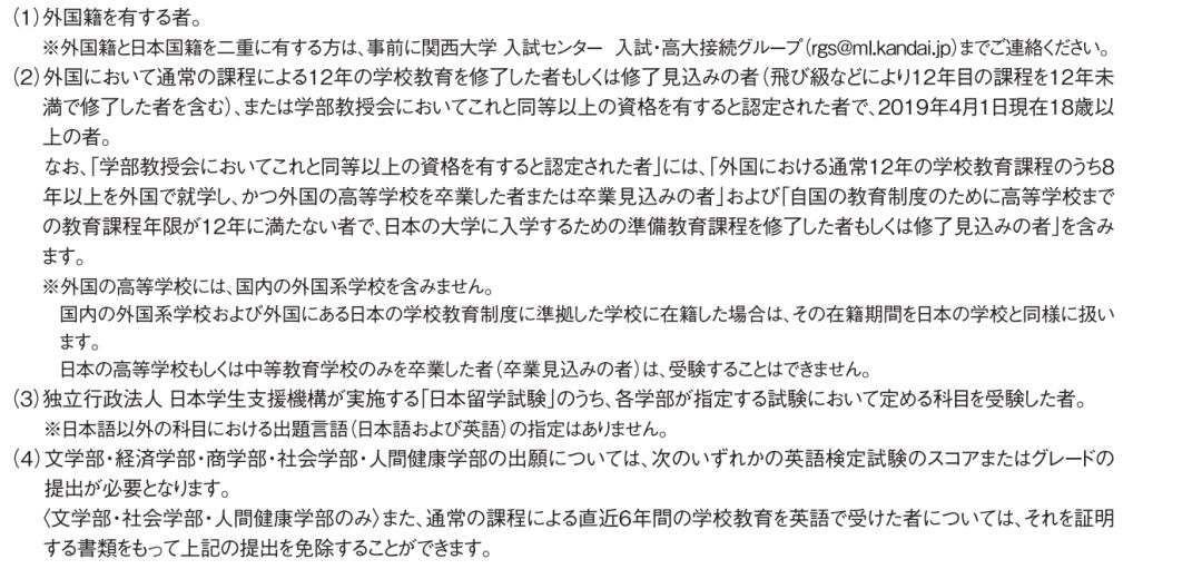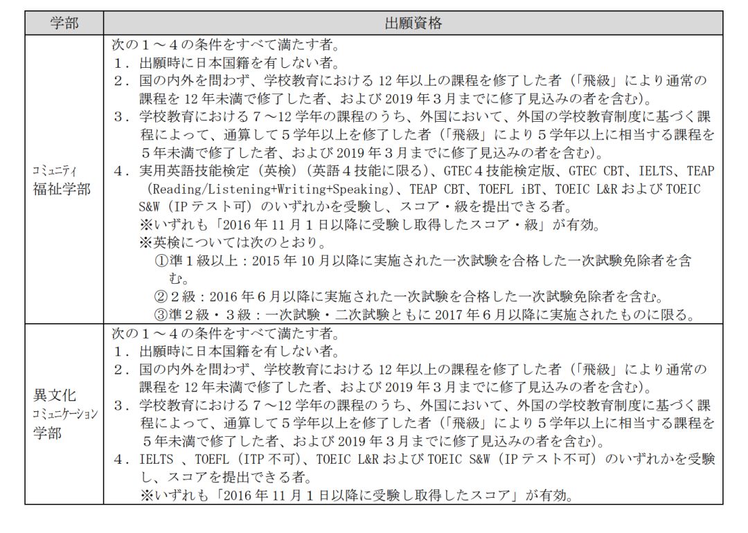 ⑴ 外国において、学校教育における12年の課程を修了した者および2019年3月31日までに修了見込の者。ただし12年の課程のうち、日本の学校教育法に基づく小学校・中学校・高等学校もしくは中等教育学校に在学した期間が通算年以内である場合も出願資格を有するものとする.